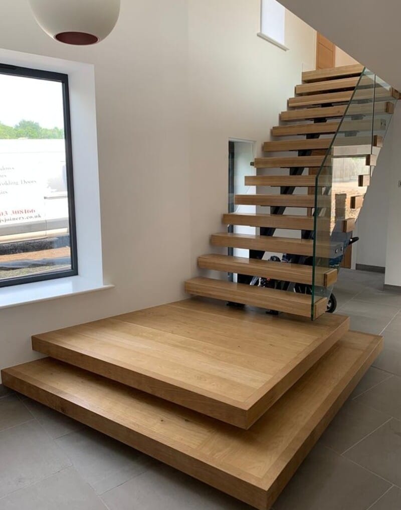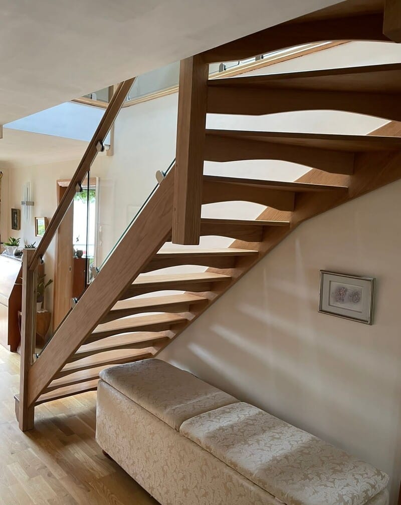 Internally we designed a beautiful cut string staircase with continuous handrail and also supplied all the rustic panelling, balcony balustrading and radiator covers.